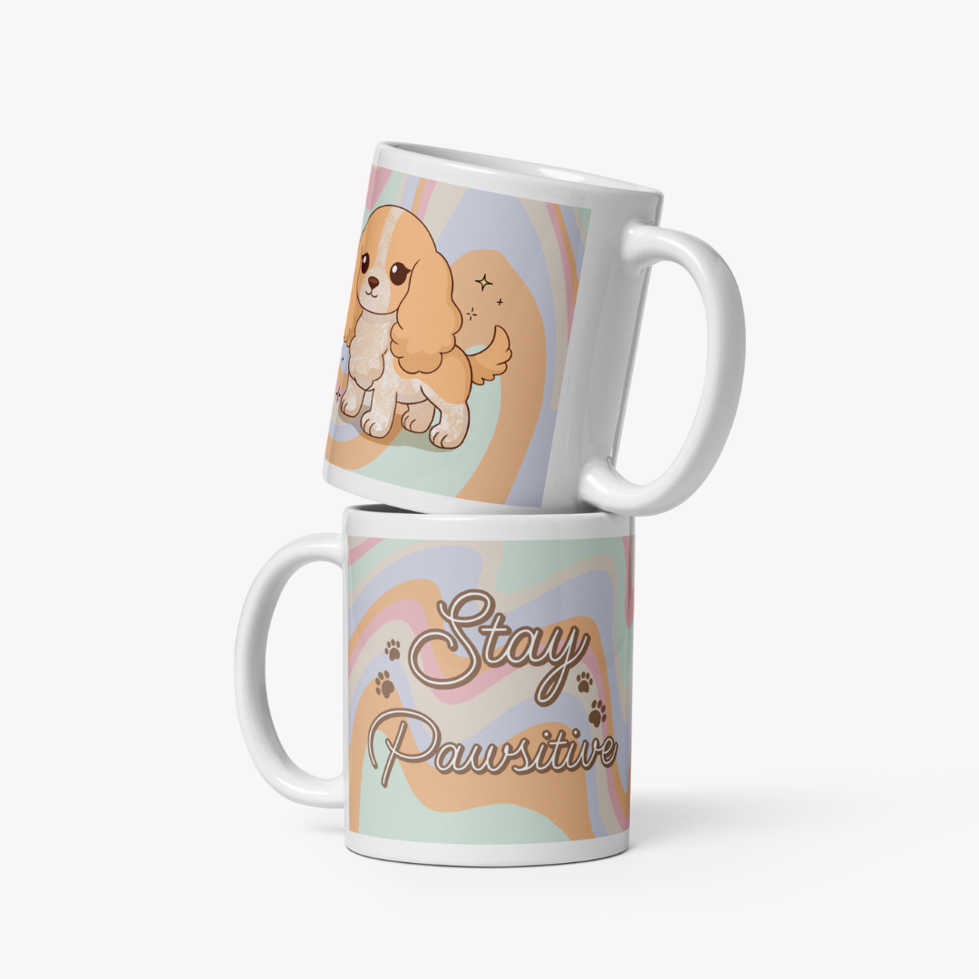 Ilustrada à mão com muito amor, tem de um lado um patudo adorável e do outro a frase inspiradora: “Stay Pawsitive” 💛