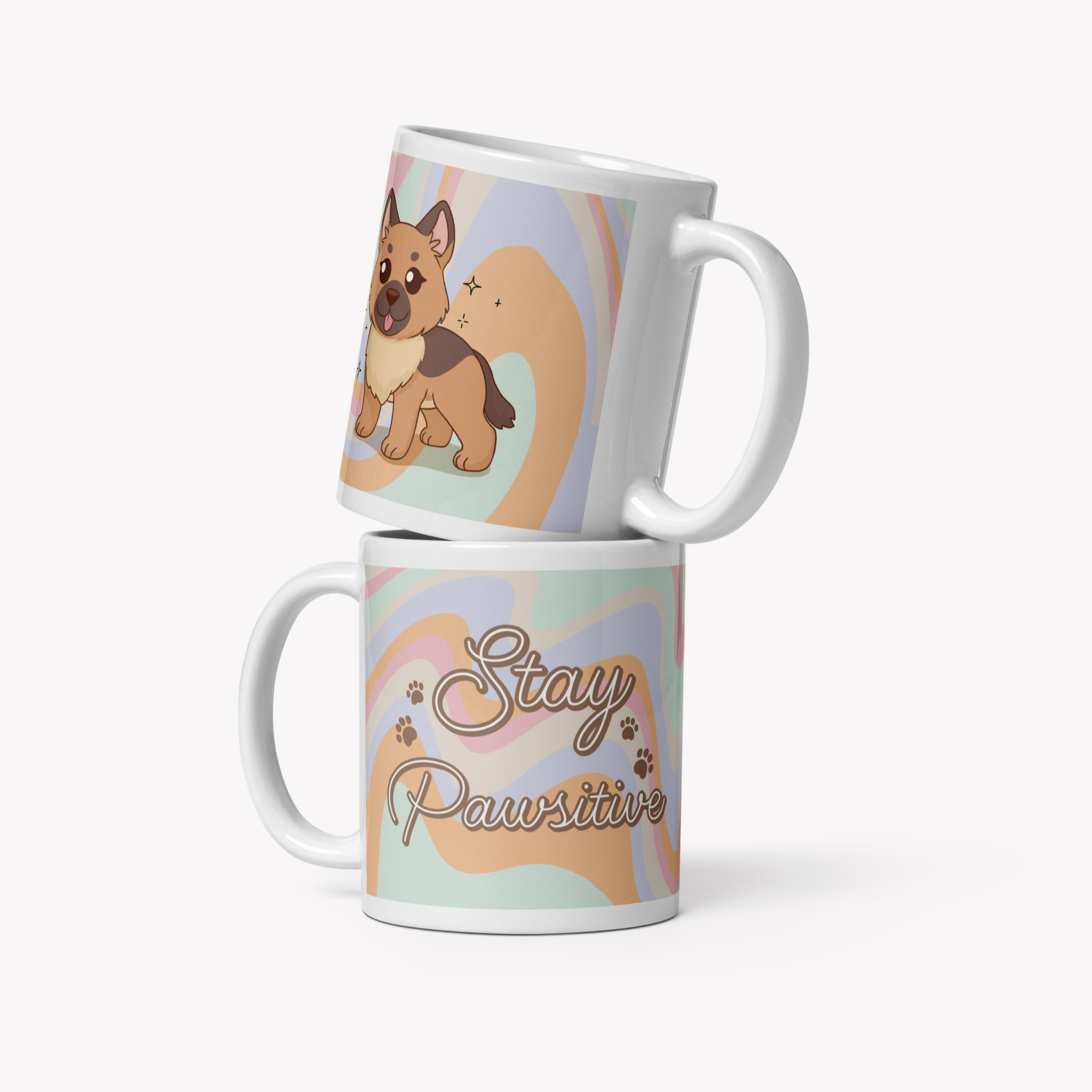 Ilustrada à mão com muito amor, tem de um lado um patudo adorável e do outro a frase inspiradora: “Stay Pawsitive” 💛
