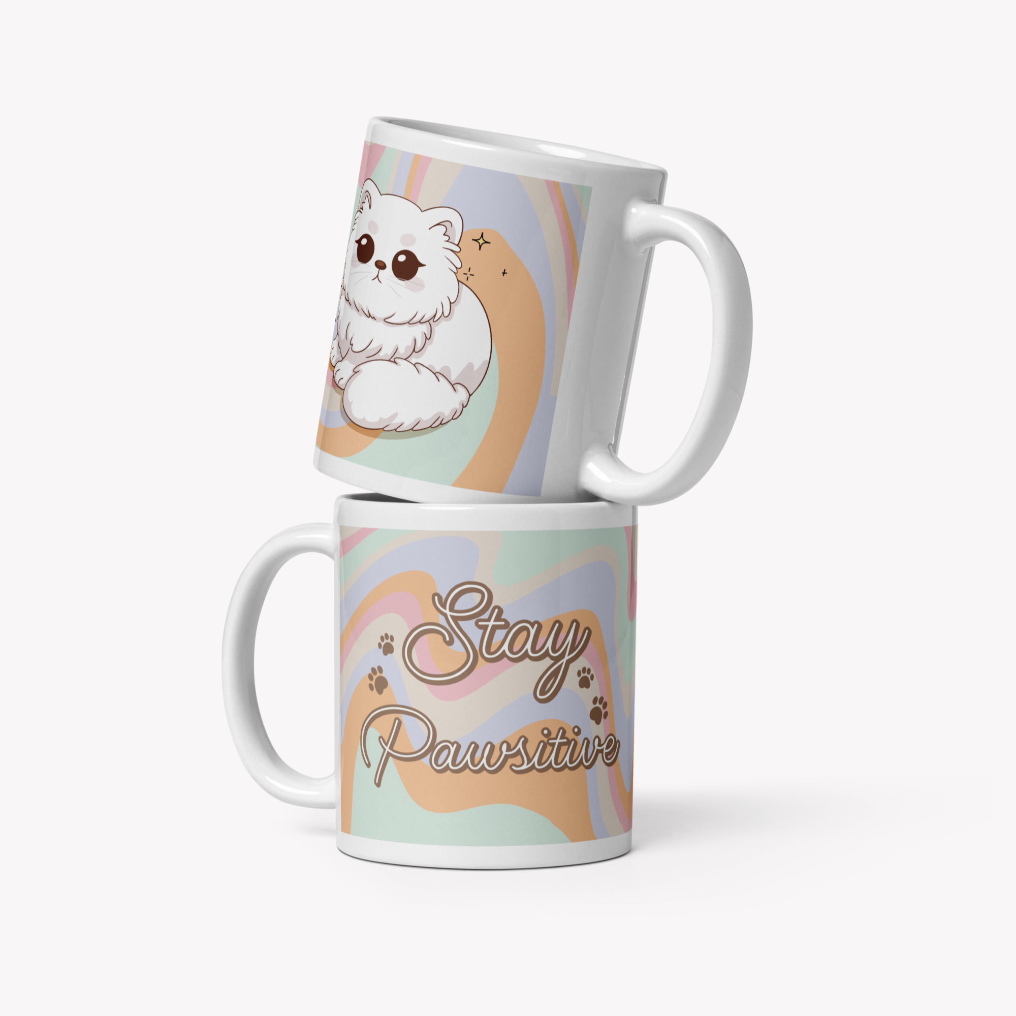 Ilustrada à mão com muito amor, tem de um lado um patudo adorável e do outro a frase inspiradora: “Stay Pawsitive” 💛