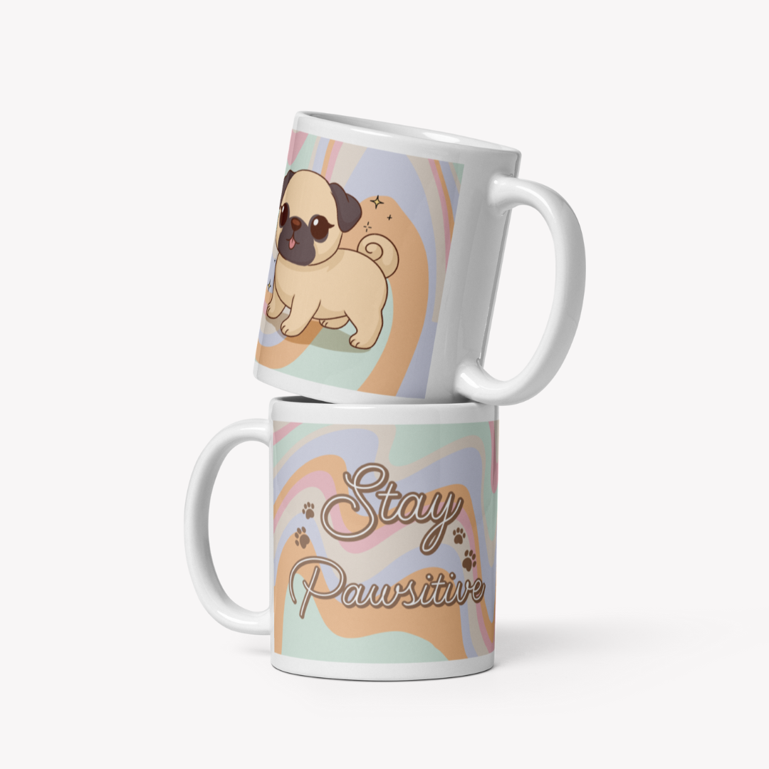 Ilustrada à mão com muito amor, tem de um lado um patudo adorável e do outro a frase inspiradora: “Stay Pawsitive” 💛