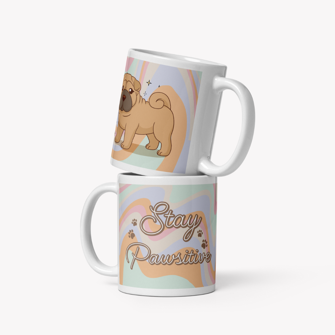 Ilustrada à mão com muito amor, tem de um lado um patudo adorável e do outro a frase inspiradora: “Stay Pawsitive” 💛